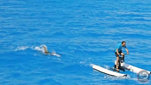 Yes, that is a man, paddling a pontoon bicycle, a few feet in front of a pursuing great white shark, wearing absolutely zero protection. #worstjobever